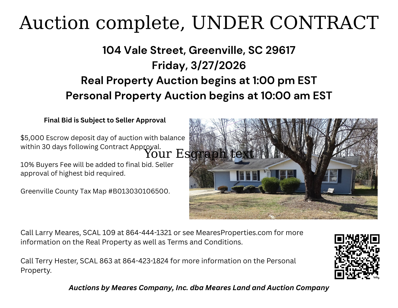 Meares Properties has over 100 years of combined experience in real estate and auctions. Centrally located in the upstate of South Carolina to meet your real estate and auction needs in South Carolina, North Carolina, and Georgia. Our company can help you sell your collectibles, old cars, equipment/tools, coins, firearms, houses, land, etc. We can also help with downsizing your home to make your move a smoother transition.